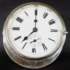 Description: Large size nickel-plated brass ship’s clock. With enamel face, second hand and push button face latch.