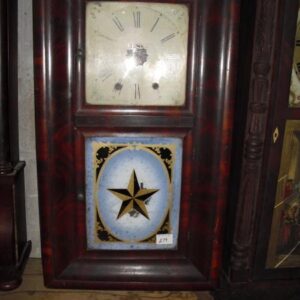 Description: Reverse on glass of a landscape with sailboat. With painted wood face, mahogany case and with key, pendulum and weights.