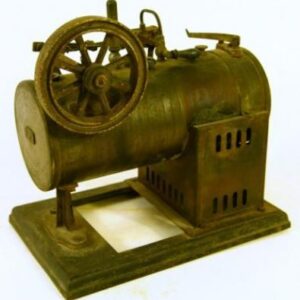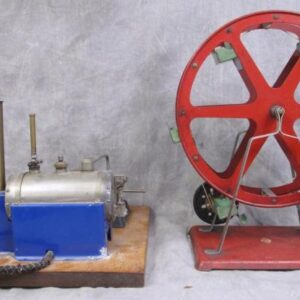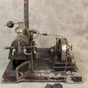 Description: A good German “DC” steam engine with original wooden box, red pinstripe. Box – with paper label. (Note: paint flaking on base.)