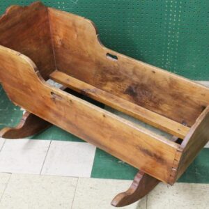 American Walnut Cradle. Ca. 1840. Dovetailed corners, scalloped crest and bold rockers.Dimensions: 38″L x 21″D x 20-1/2″H
