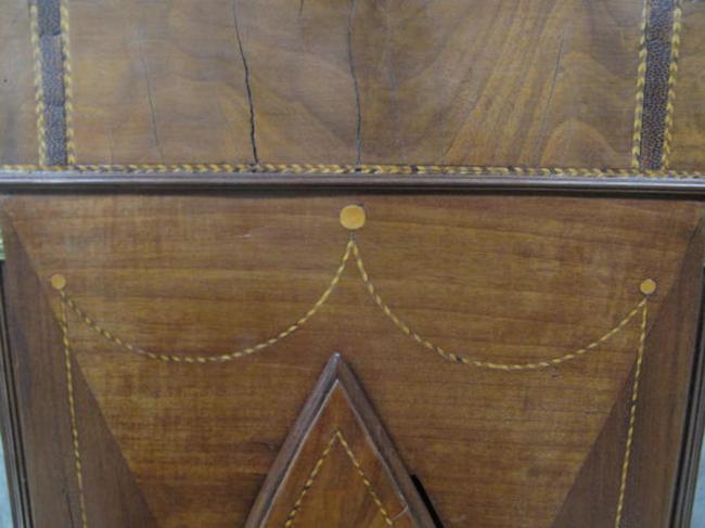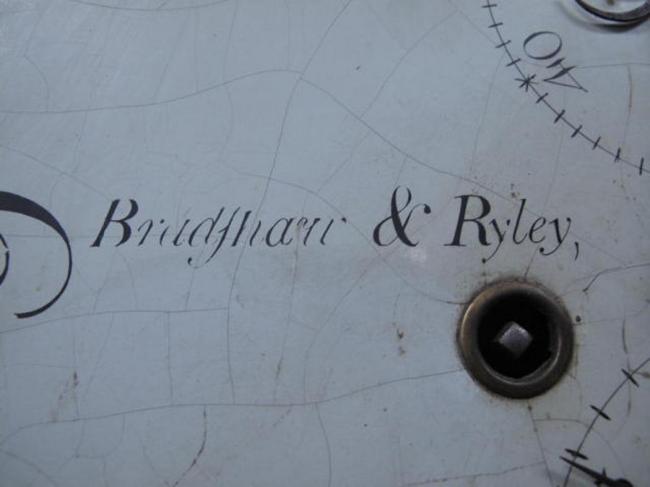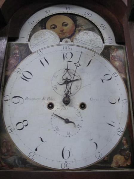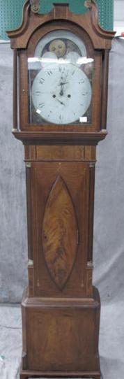 Description: Ca. 1790-1810. Barber pole inlaid case with tassel drops, fluted quarter columns, unusual elliptical door on front with English eight-day movement. Signed Bradf. A… Ryley Coventry. Decorated Moon phase dial with two small dials with hands and pendulum with weights. (Note: case with loss and repairs and front bottom panel warped.)