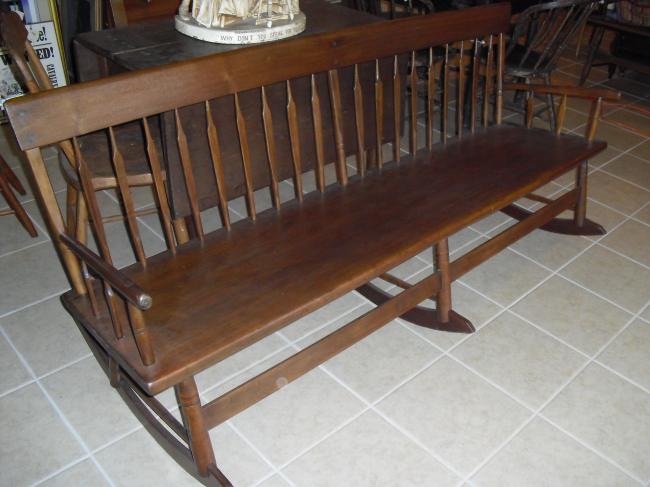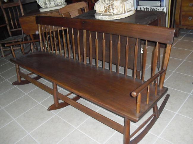 Description: Rocking bench with beautiful, simple hand-carved spindles. Similar to a Mammy’s bench 1800-1850.