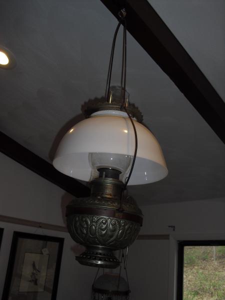 Description: Bradley & Hubbard Brass shop lamp electric w/shade and chimney.