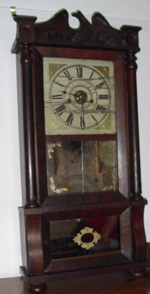 Description: Forestville Clocks, Bristol, Connecticut with reverse panel and eagle crest and a painted wooden face