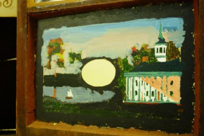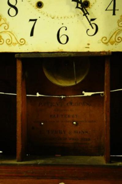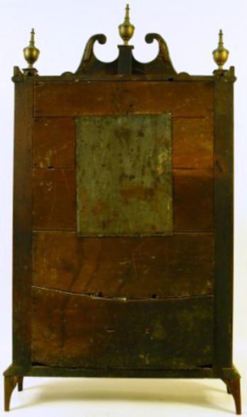 Description: Reverse on glass of a landscape with sailboat. With painted wood face, mahogany case and with key, pendulum and weights.