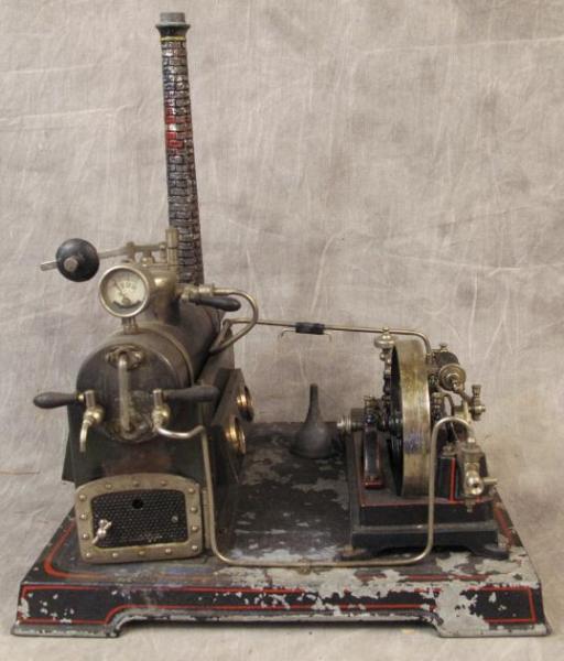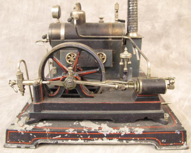 Description: A good German “DC” steam engine with original wooden box, red pinstripe. Box – with paper label. (Note: paint flaking on base.)