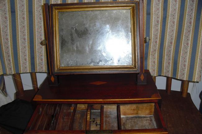 Description: Shaving Mirror on small inlaid jewelry chest.