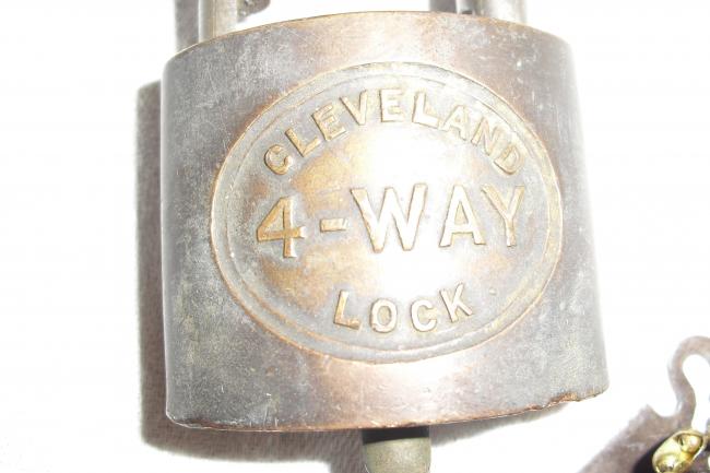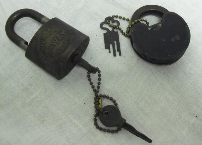 Description: 2 locks complete with keys. (1) Cleveland 4-way with 2 keys (2) Antique Lock with Fork-type key.