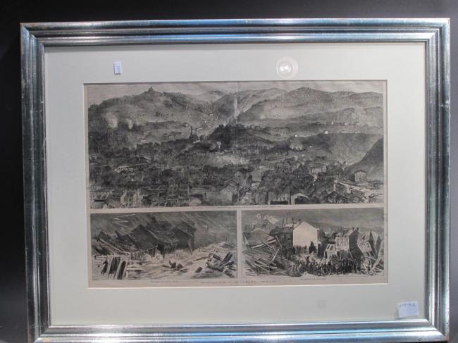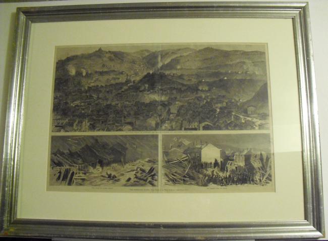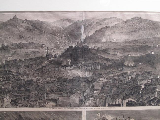 Description: The Pittsburgh Flood from Sketches by Theo. R. Davis 1) The Upper Portion of Alleghany City, Showing Butcher’s Run and Spring Garden Run. 2) The Flood in O’Hara Street. 3) The Search for the Dead. Harpers Weekly (matching P211).