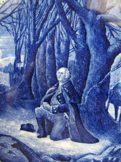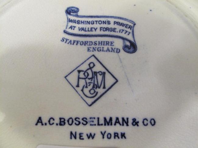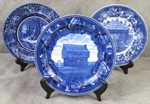 Description: 3 blue and white historical transfer plates. English. Including “Period Block House”, “Washington’s Prayer” another block house for Joseph Horne Co.