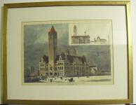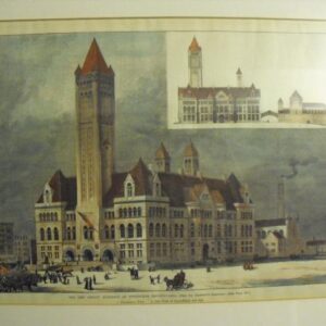 Description: County Buildings in Pittsburgh, PA, from the Architect’s Drawings. 1) The Perspective View. 2) Side View of Courthouse and Jail, Harper’s Weekly.