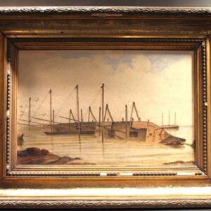 Description: Watercolor on Paper, Unsigned, The salvage of a sailing ship cast over on the starboard, with figures. English.